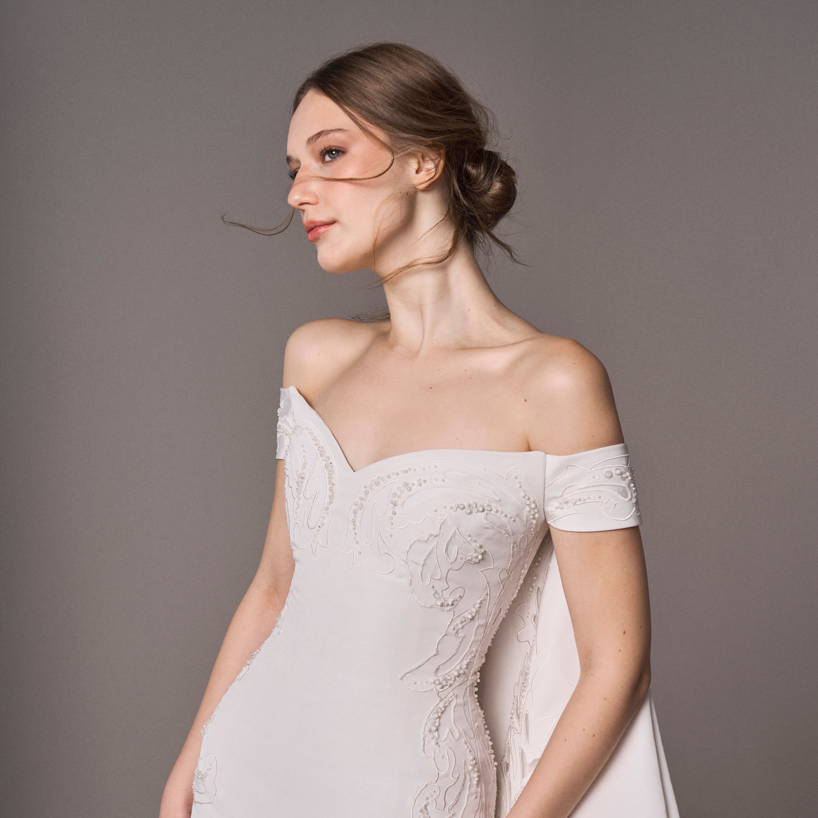 Classy off -shoulder wedding dress with long train and sequins details (Sale)